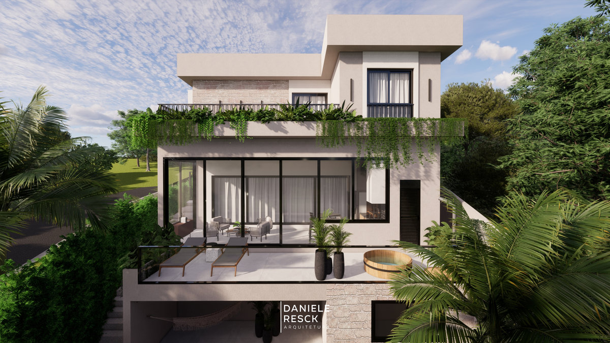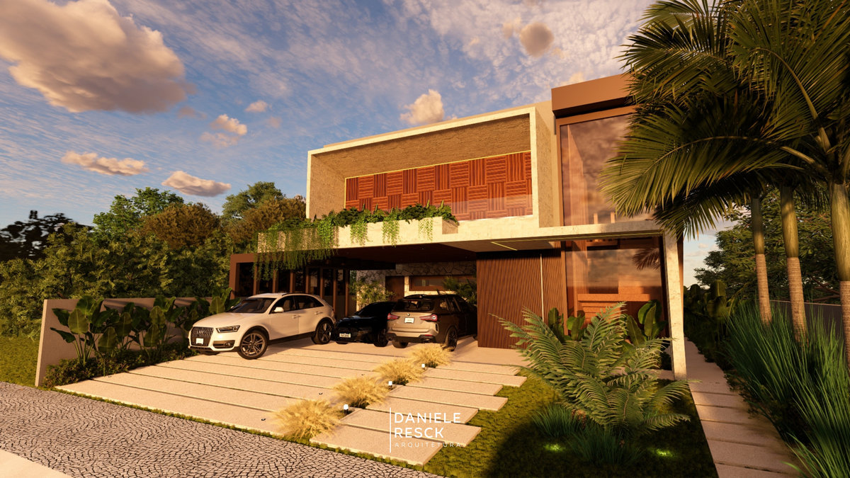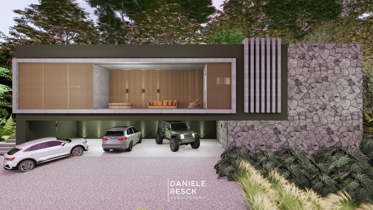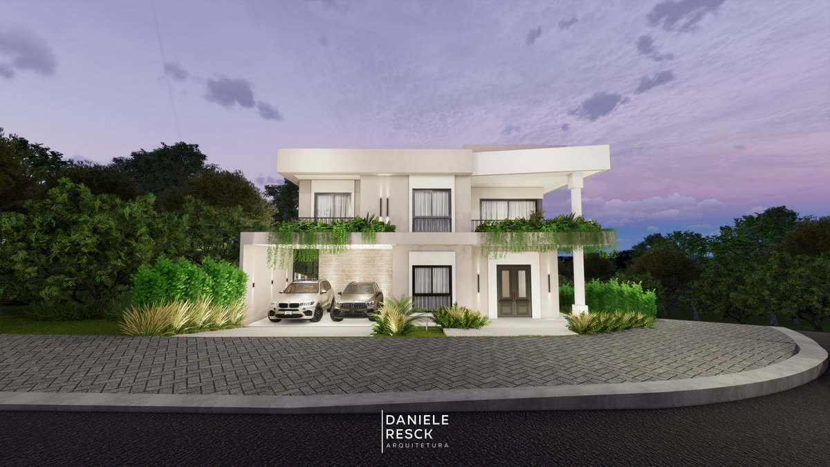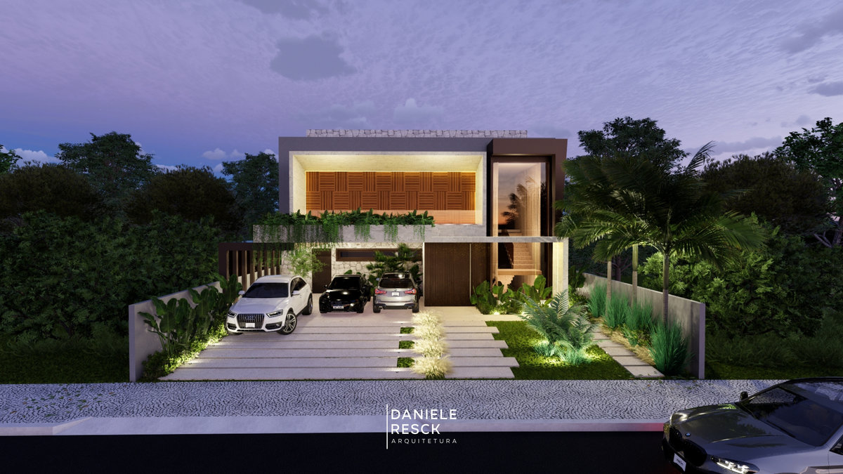 Casa projetada para um casal com dois filhos em um terreno com área plana. O conjunto de estudo de fachadas é composto por 03 versões diferentes, todos com a predominância de uma arquitetura geométrica e contemporânea. As linhas retas e a união de elementos modernos como esquadrias em alumínio preto, painéis ripados em alumínio amadeirado, concreto e vidros criam uma arquitetura conceitual. As jardineiras presentes em todas as versões dos estudos trazem elegância e vida à fachada. O interior da residência se destaca pelos seus ambientes confortáveis, funcionais e integrados. A integração dos espaços gourmet, piscina e o paisagismo bem elaborado enobrece a edificação em todos os aspectos.