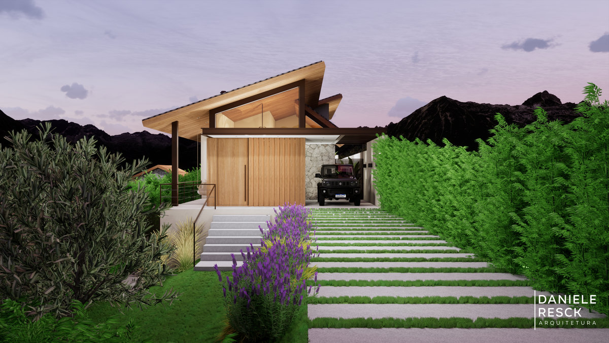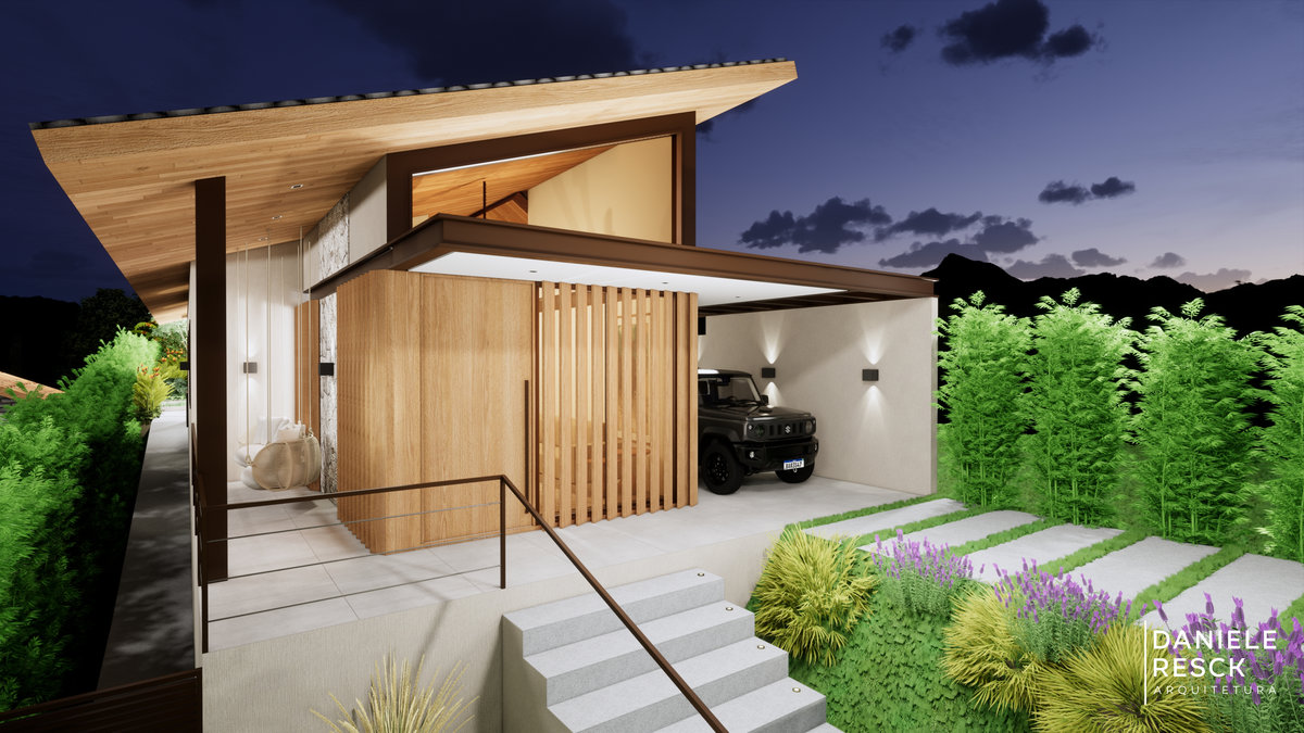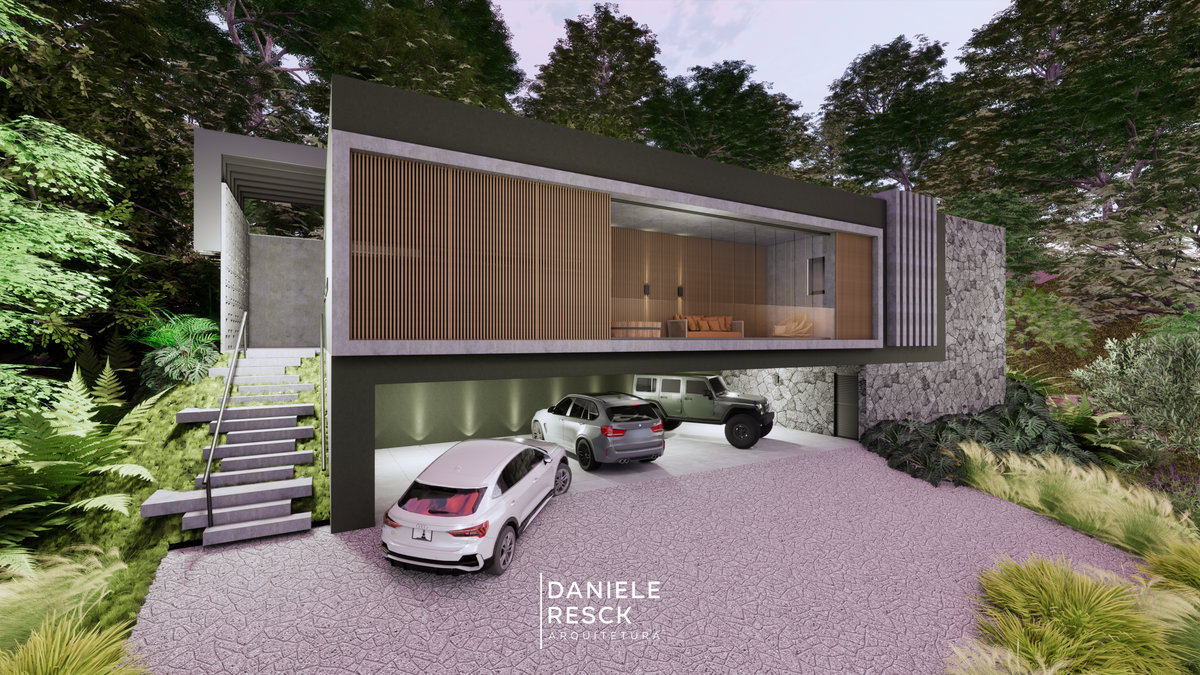 Uma residência projetada para uma família de 4 pessoas com estilo moderno mas sem abrir mão do contato com a natureza. A casa implantada em um terreno com aclive precisa de cuidados específicos mais também tem vantagens como a possibilidade de ter um mirante dentro da sala. Fachada com linhas retas, telhado embutido, esquadrias em estrutura metálica e portas/janelas com acabamento metálico amadeirado valorizam o projeto. Os pergolados em estrutura metálica também trazem personalidade para obra. A casa foi implantada priorizando a integração dos ambientes de modo que fiquem todos no mesmo nível. A garagem e áreas técnicas ficam discretamente localizadas no subsolo da casa, aproveitando o desnível do terreno. O astral e o posicionamento da edificação fazem dessa casa um mirante privativo!